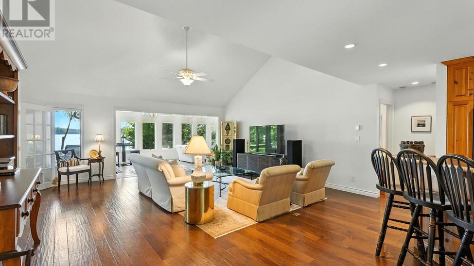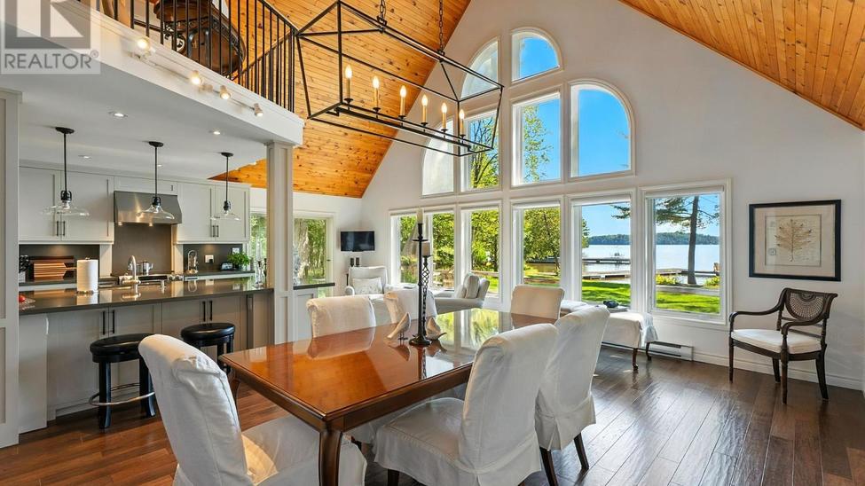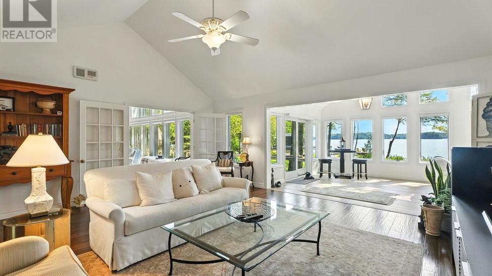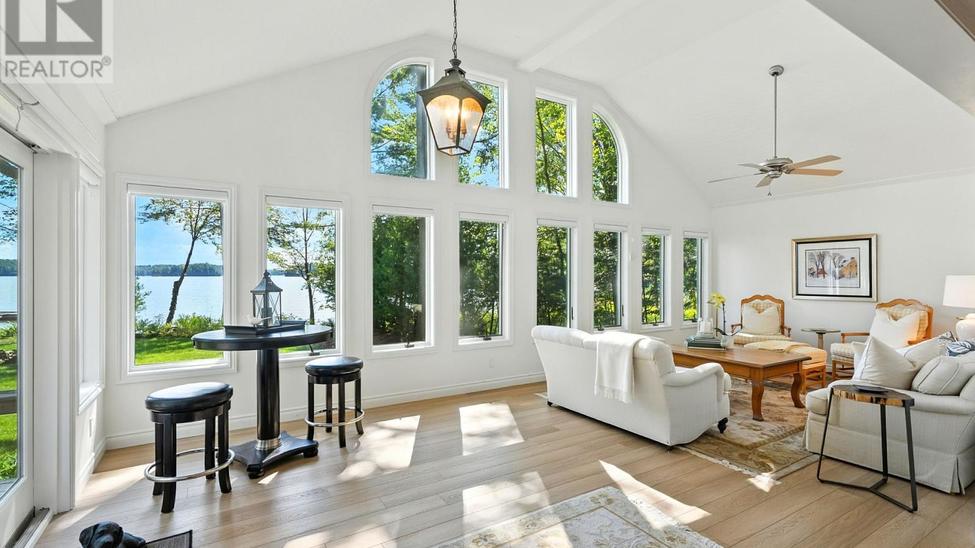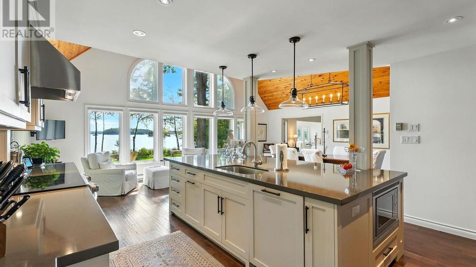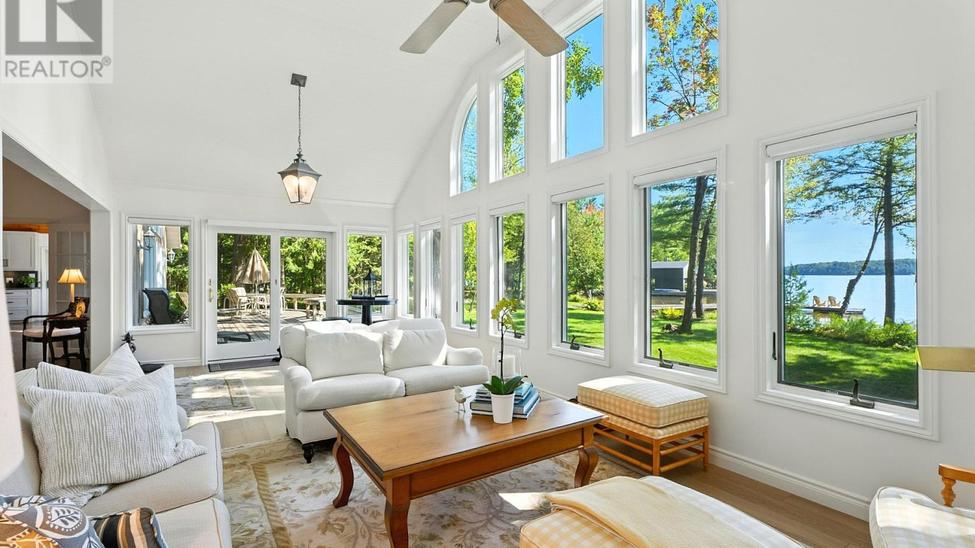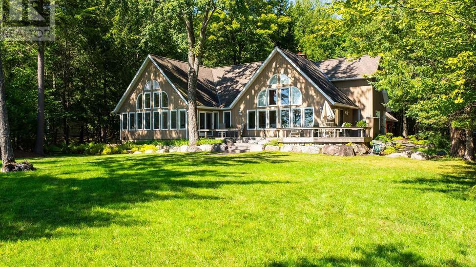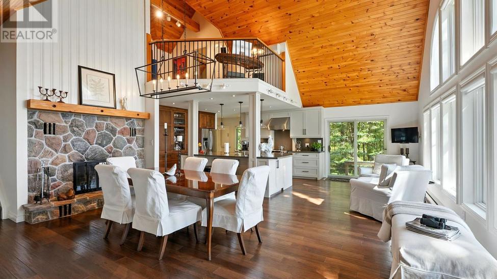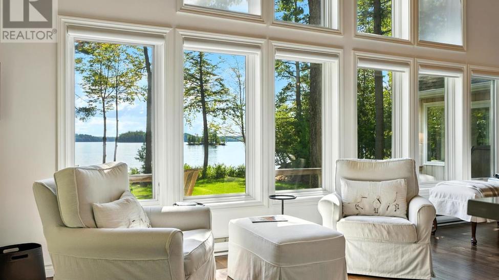 Set on the coveted shores of Lake Rosseau, this exceptional 1.7-acre family retreat offers everything you envision in a Muskoka cottage southwest exposure, a level lot, and long, protected lake views that feel like your own private paradise. With year-round access and a location just minutes from Port Sandfield and the JW Marriotts spa and dining, this property effortlessly combines seclusion with convenience. Enjoy pristine waterfront complete with a sand beach and spacious dock ideal for sun-soaked afternoons, water sports, and gathering by the lake. Mature gardens and a generous wrap-around porch frame the cottage, creating idyllic outdoor living spaces perfect for family connection and relaxed entertaining. Inside, the 4-bedroom, 3-bathroom cottage impresses with soaring vaulted ceilings and a full wall of windows that draw Lake Rosseau's beauty right into the heart of the home. An open-concept layout enhances the sense of space, anchored by a stunning chefs kitchen with quartz island and backsplash, stainless steel appliances, and a walk-in pantry. A wood-burning fireplace adds warmth and charm to the dining area, while the sunroom offers a peaceful spot to unwind. Thoughtfully designed with year-round comfort in mind and function, the home features hydronic in-floor heating, a main-floor guest suite with 3-piece bath, a versatile office or overflow bedroom, and an upper-level primary suite with a lofted office nook overlooking the living space. Engineered hardwood throughout, beautifully tiled bathrooms, and ductless AC units provide modern ease, while a paved driveway, two-car garage, and carport ensure ample parking for guests. This Lake Rosseau gem is the ultimate Muskoka escape private, picturesque, and perfectly suited for generations of family memories.